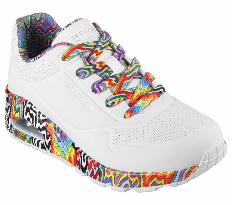 Klasické tenisky s masivním podpatkem dostávají zcela nový vzhled díky poutavým a barevně dynamickým designům z nejnovější kolekce Skechers x Jen Stark. Design nejen oslavuje známé vícebarevné kapání umělkyně Jen Stark na dolní části, ale také upoutá průhlednou podrážkou, která odhaluje atraktivní vzor po celé délce obuvi. Tyto živé barevné akcenty jsou spojeny s pohodlím zajištěnému díky speciálním vložkám Skechers Air-Cooled Memory Foam®.
