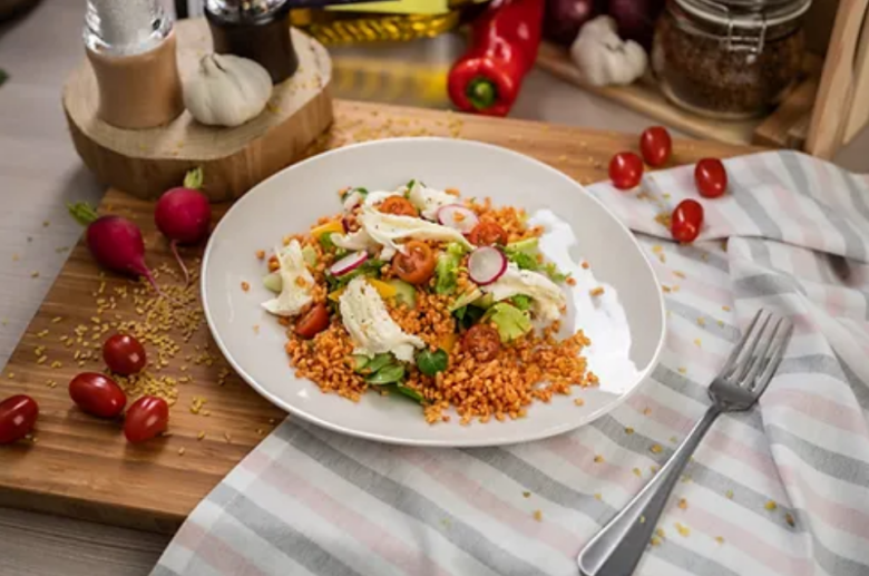 Křehký listový salát s medovým dresingem, rajčatovým bulgurem a mozzarellou.