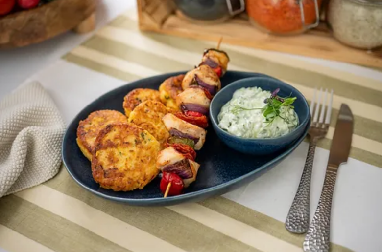 Jáhly spaříme horkou vodou a vložíme do vroucí osolené vody. Vaříme cca 15 minut do měkka. Zbytek vody scedíme a jáhly necháme vychladit. Poté k nim přidáme najemno nastrouhanou mrkev a cuketu, vejce, nadrobno nakrájenou cibulku, rozdrobené kvasnice a dochutíme solí a pepřem. Dobře promícháme a zahustíme hladkou moukou. Z těsta vytvarujeme placky o tloušťce cca 1,5 cm, které necháme 25 minut na teplém místě vykynout a poté je pomalu smažíme dozlatova z obou stran. Na tzatziki nastrouháme okurky, které osolíme, necháme 15 minut odpočinout a poté z nich vymačkáme vodu. Jogurt osolíme, opepříme a vmícháme do něj olivový olej a nasekaný čerstvý kopr. Vše spojíme a ochutíme česnekem a citrónovou šťávou. Maso na špízy nakrájíme na větší kostičky, osolíme a pepříme. Dále si nakrájíme Papriku, červenou cibuli i klobásu nakrájíme na zhruba stejně velké části. Maso a zeleninu střídavě napichujeme na špejli. Špízy opékáme ze všech stran na
