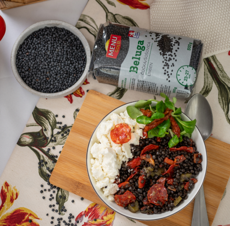 Zelené papriky den předem vložíme do trouby rozpálené na 250 °C a zprudka pečeme cca 10 minut. Jakmile se na slupkách paprik vytvoří puchýřky, vytáhneme je z trouby, přikryjeme a necháme 10 minut odstát. Poté nám půjdou krásně oloupat. Ještě teplé je nakrájíme na kostičky, přidáme nakrájený česnek, zalijeme olivovým olejem, osolíme a necháme přes noc marinovat. Čočku beluga vložíme do vroucí vody a vaříme cca 25 minut, aby zůstala al dente. Na oleji z paprik orestujeme nadrobno nakrájenou šalotku, přidáme sušená rajčata, marinovanou papriku a uvařenou čočku. Vše spolu prohřejeme, osolíme a pepříme dle chuti. Na závěr přidáme nasekanou petrželku. Fetu rozdrobíme na menší kousky a podáváme společně s čočkovým salátem.