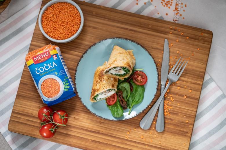 Červenou čočku propláchneme a namočíme přes noc do studené vody. Druhý den osolíme, rozmixujeme tyčovým mixérem a necháme 5 minut odpočinout. Nepřilnavou pánev potřeme olejem a po celém dně roztáhneme těsto v tloušťce asi 2 mm. Opečeme z obou stran. Do jogurtu vmícháme utřený česnek, lžíci olivového oleje, osolíme a opepříme. Hotové placky plníme špenátem, který jsme ochutili olejem ze sušených rajčat. Poklademe nakrájenou fetou, čerstvými i sušenými rajčaty a jogurtovým dresinkem. Zabalíme do tortill a podáváme.